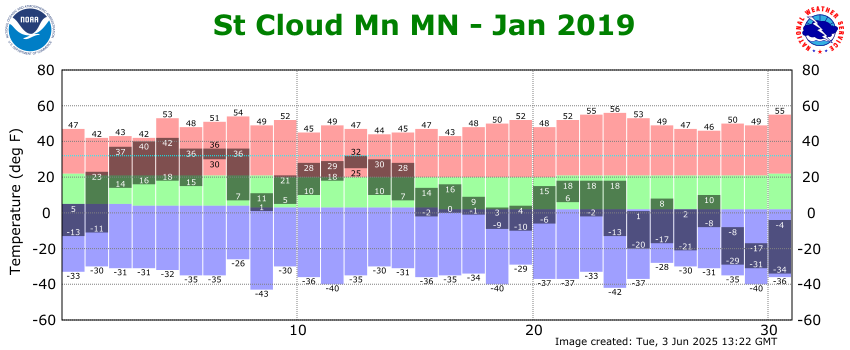 The winds are expected to ease up Friday night, which could give St. Cloud a shot at its first -30 low since January 30-31, 2019 and a second straight day of sub-zero highs on Saturday. Record cold highs for Friday and Saturday are -16, so that would be a hard temperature to reach (Feb. 2, 1996 had a high of -20, tying St. Cloud's coldest high temperature on record). The record cold low on Saturday is -42 (temperatures colder than -40 have only been reached in St. Cloud earlier than the 1920's). Friday's record cold low of -33 might be achievable if the winds die out quickly Friday evening. As I noted in the December 2025 weather summary, St. Cloud hasn't set a record cold low during the winter months since December 18, 2013.