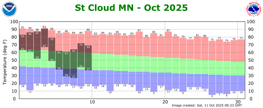 Our major precipitation turn around from being very wet during June and July (12.47 inches, 5.12 inches above average) to being dry from the start of August on (now 3.45 inches, 4.34 inches below average) rolls on. That problem is shared by much of Minnesota to the north and east of Morris and Alexandria (yellow and red areas on the NWS Water Prediction Service, set time to yesterday, period to last 90 days, and departure from normal). As noted in my September 2025 St. Cloud weather summary, there has been a recent trend of significant dry spells at least towards the end of the growing seasons in the past 5 years. This keeps my mind on how difficult long-range forecasting is.