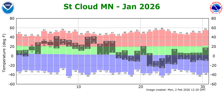 St. Cloud has now made it through 29 days with a sub-zero low (average 42.7 for cold season), 4 days with a high of zero or colder (average 4.3 days for cold season), and 4 days with a low of -20 or colder (average 5.4 days for cold season).